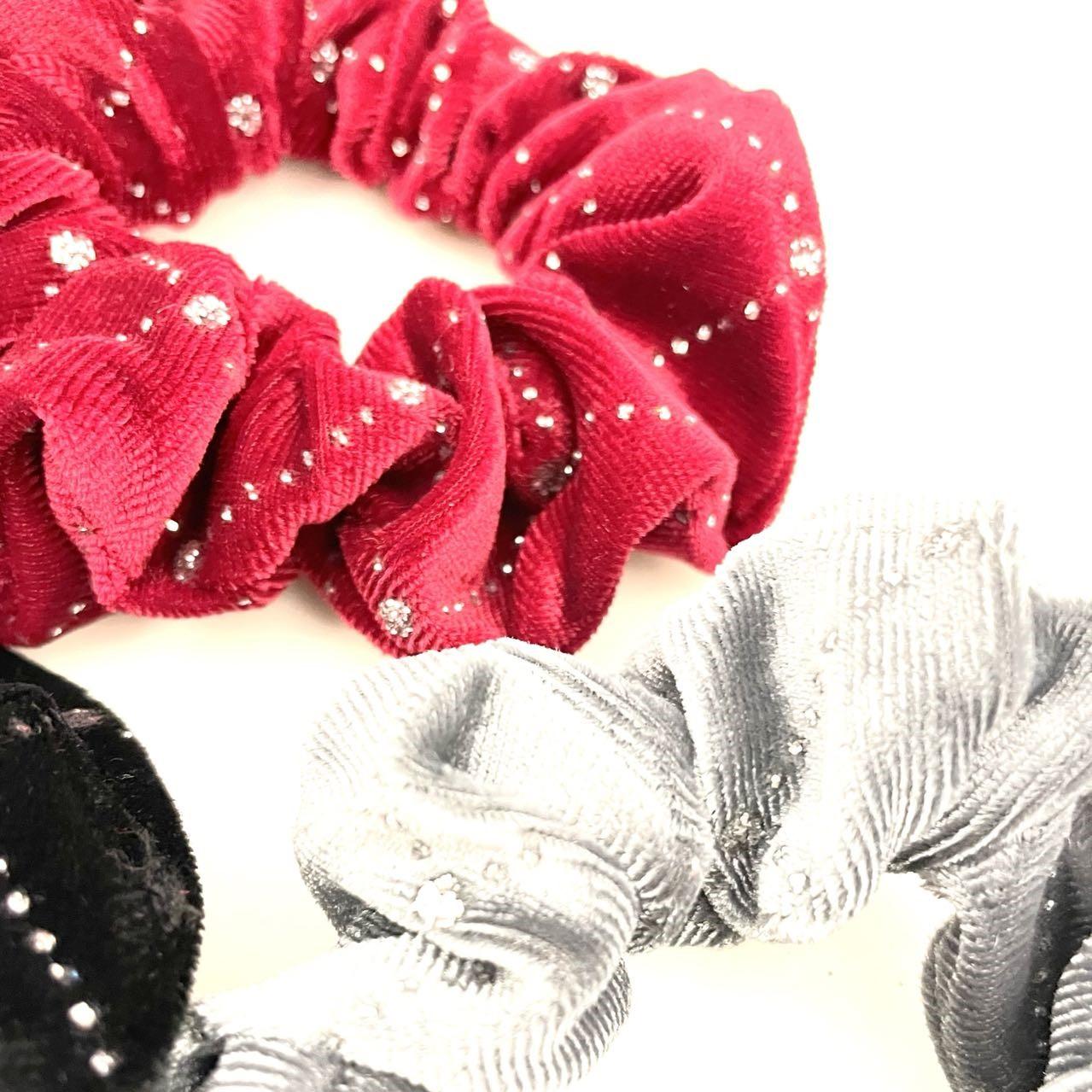Card of 1 Silver Printed Velvet scrunchy, Burgundy /Grey / Black Assorted